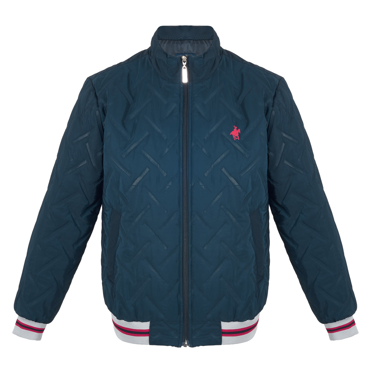 Elegancia y confort se fusionan en esta chamarra de poliéster fino. Azul marino clásico, caballito bordado en rojo, y detalles tejidos en crema y rojo. Un look sofisticado y deportivo para el profesional moderno.